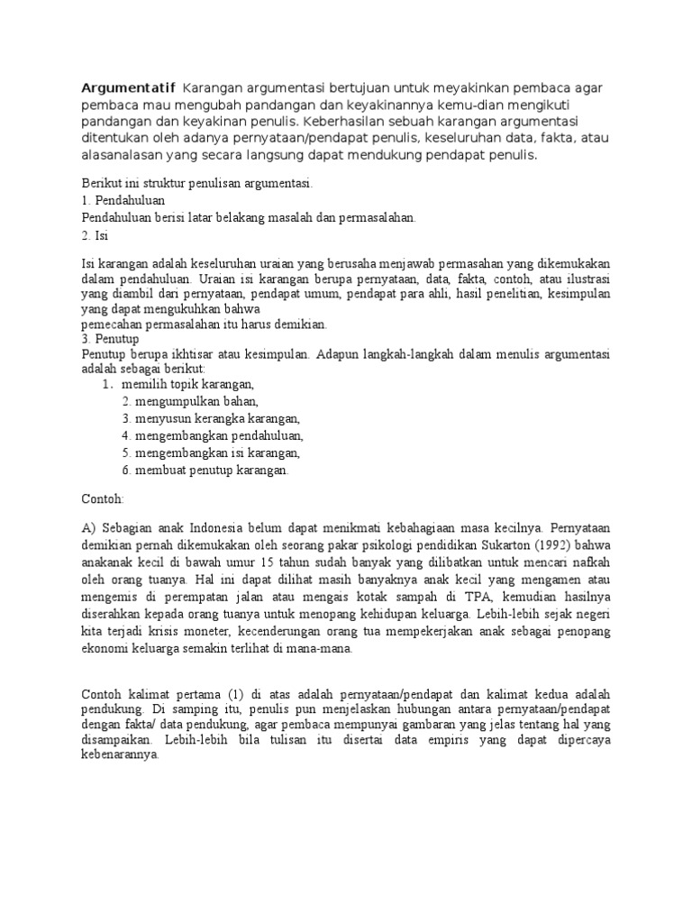 Oseng kangkung bisa menyebabkan orang mengantuuk. Memecahkan masalah tanpa harus memiliki sebuah hasil yang pasti. Misalkan buku, majalah, koran, dan media infomasi antimainstream di internet. Pernyataan argumentatif adalah sebuah pernyataan atau kalimat yang bersifat memberikan alasan untuk memperkuat atau menolak suatu pendapat. Proposal kegiatan ini sangat bermanfaat karena.